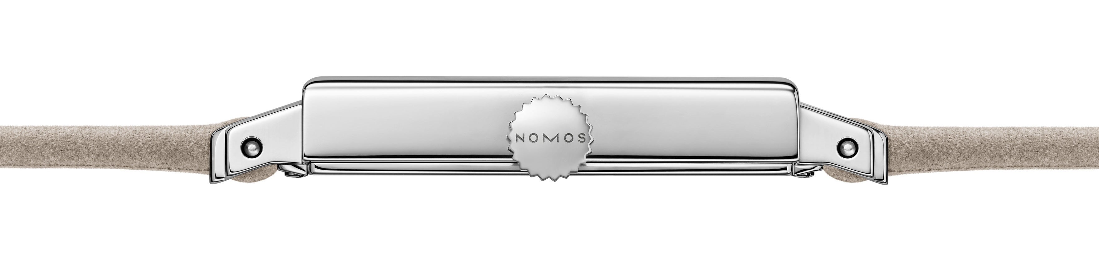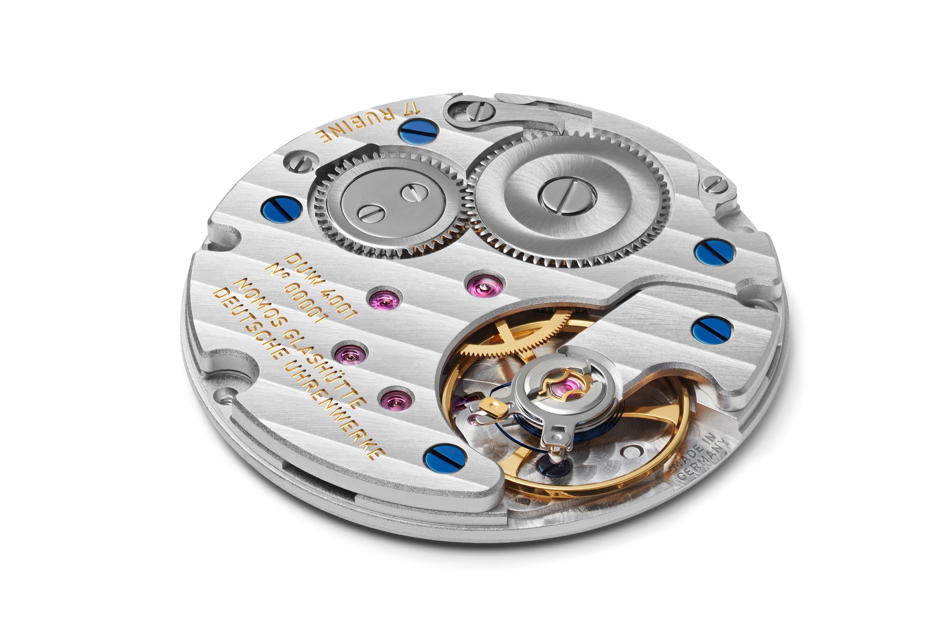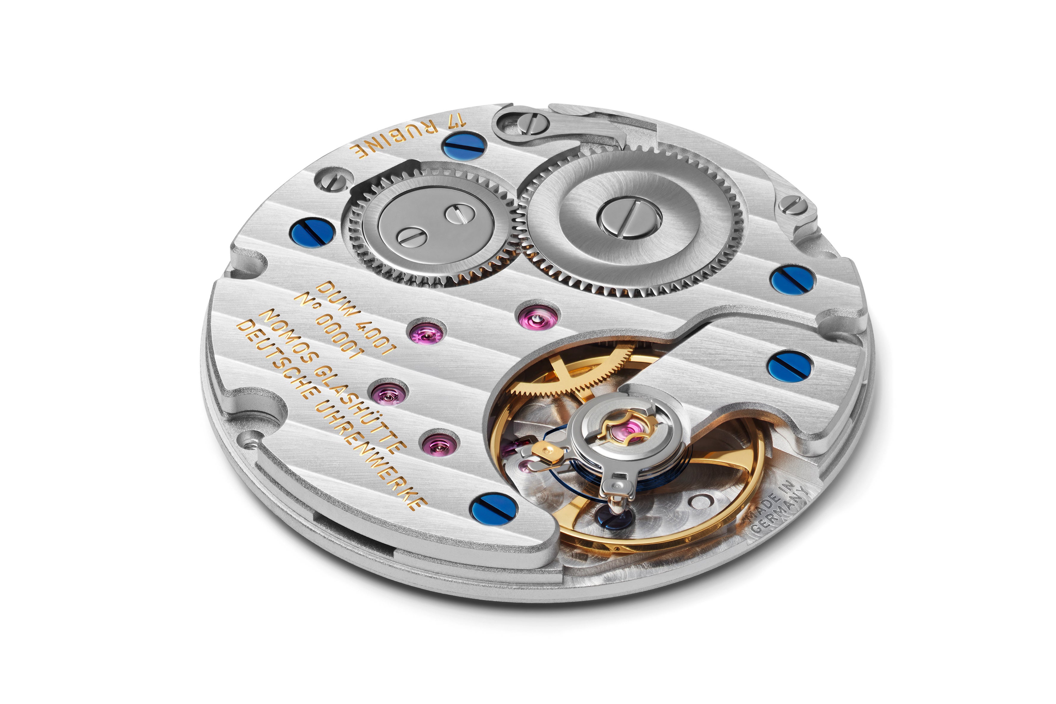 29.5 mmのスクエアケースの内部で時を刻むのは、ノモス スウィングシステムを備える手巻き式キャリバー「DUW4001」です。堅牢性、精度、信頼性を併せ持つこのキャリバーは、ノモスの多くの腕時計の内部で時を刻んでいます。