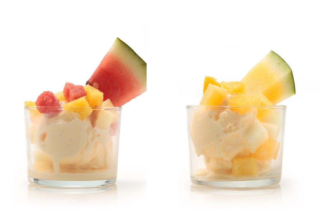 熊本産春スイカの果肉を加えたマチェドニアをヴァニラジェラートにトッピング。