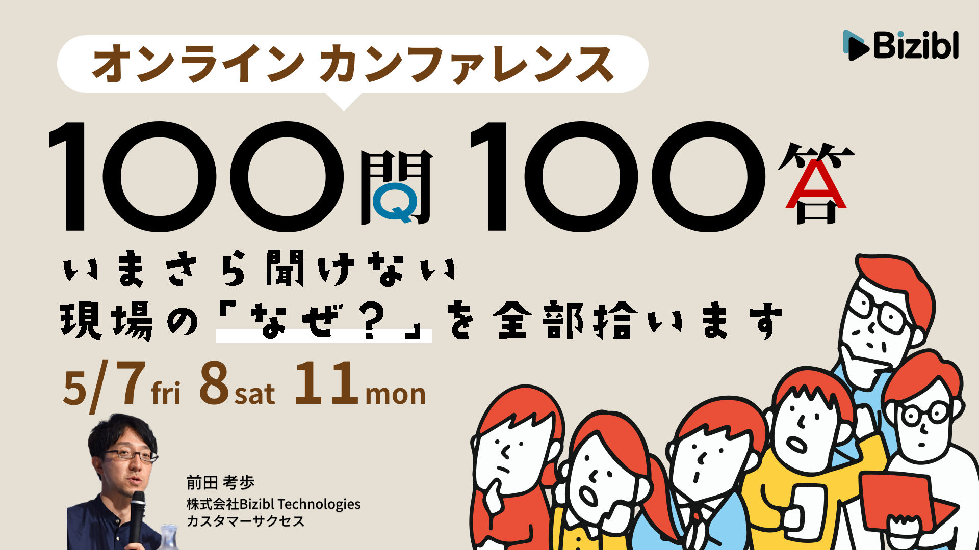 ウェビナーマーケティングツール「Bizibl(ビジブル)」を提供する株式会社Bizibl Technologies(本社:東京都千代田区、代表取締役:花谷 燿平、以下 Bizibl)は、オンラインカンファレンス運営および共催ウェビナー運用における現場実務をテーマとしたウェビナー「オンラインカンファレンス 100問100答〜いまさら聞けない現場の『なぜ?』を全部拾います〜」および「共催ウェビナー 100問100答〜いまさら聞けない現場の『なぜ?』を全部拾います〜」を、2026年5月7日(木)から5月11日(月)までの期間、Bizibl上にて開催いたします。
