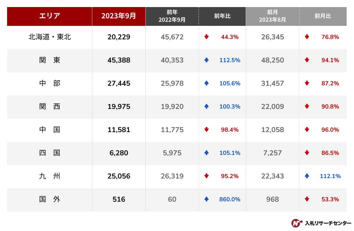 2023年9月のエリア別公示案件数は、エリアにより、前年より増加・減少の傾向が分かれました。