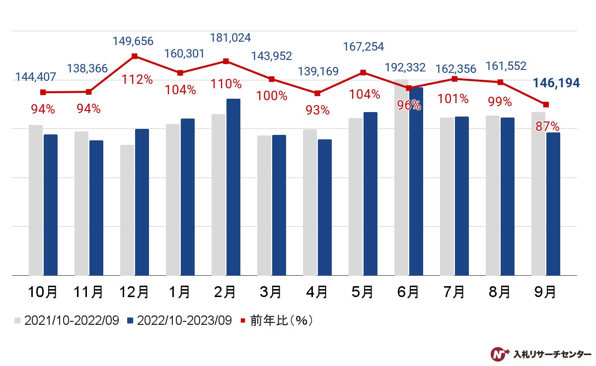 2023年9月の公示案件数の総計は146,194件で、前年比87%となりました。