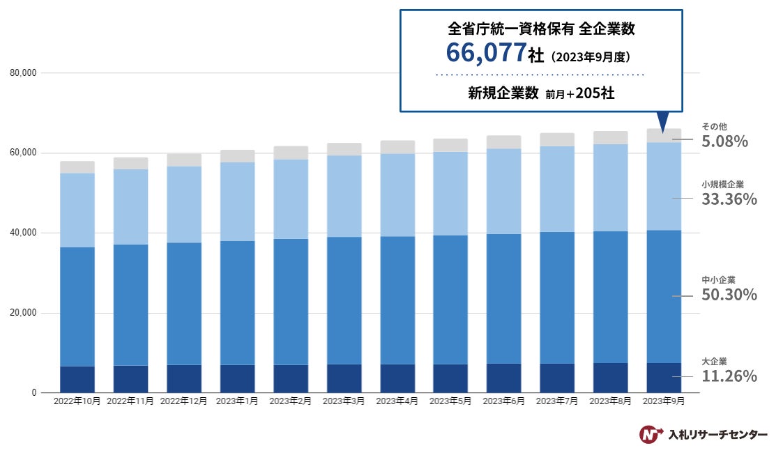 全省庁統一資格保有【全企業数】:66,077社(2023年9月度)