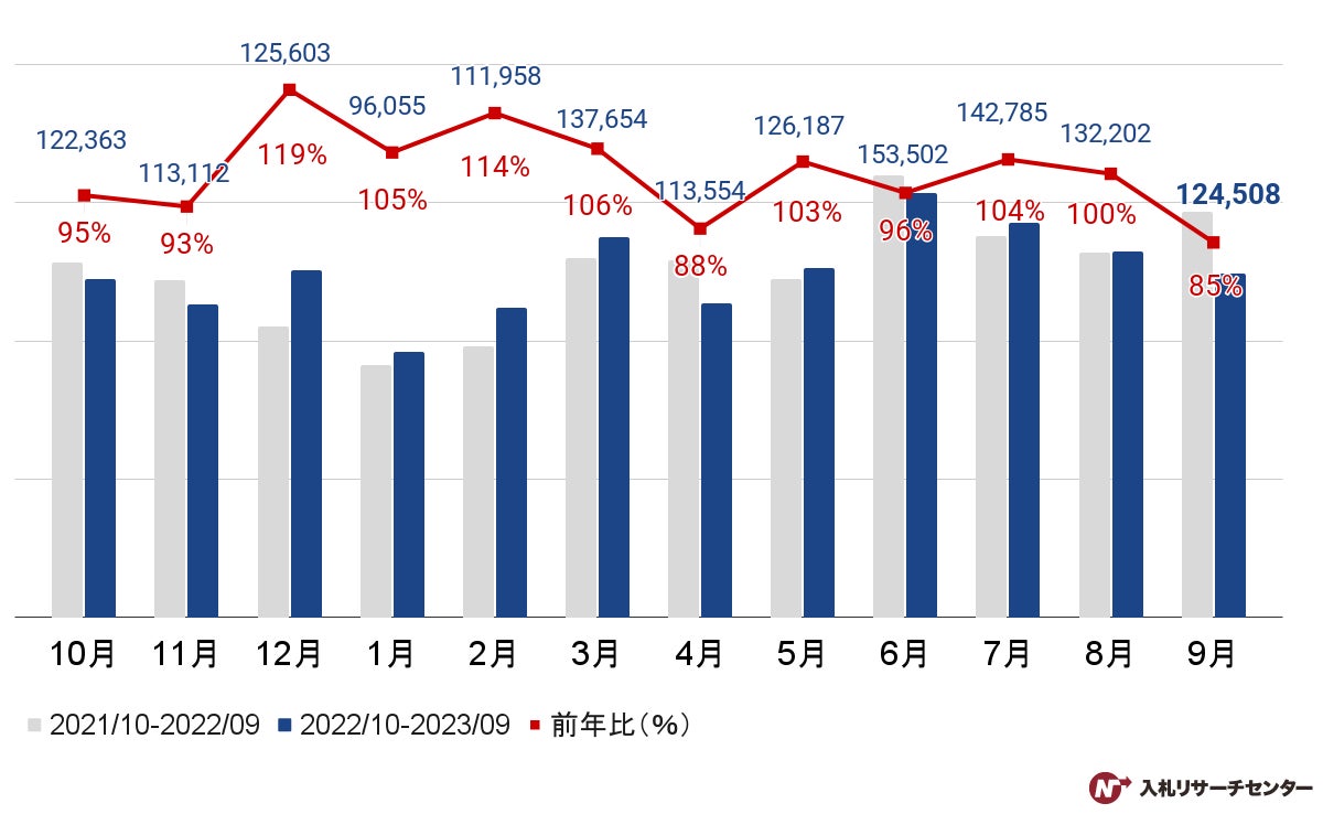 2023年9月の落札案件数の総計は 124,508件で、前年比85%となりました。