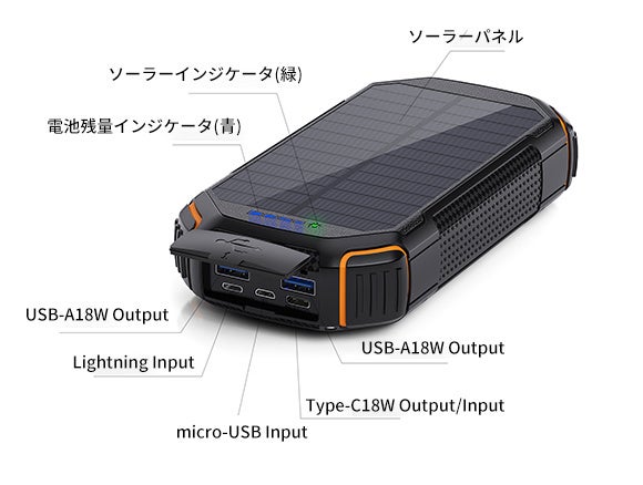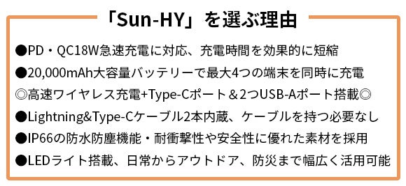 日常・災害時・アウドドアに大活躍!20000mAhの大容量!PD・QC急速充電に対応したソーラーモバイルバッテリー「Sun-HY」