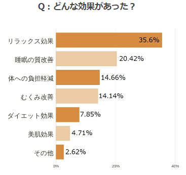美容に関する内容では、むくみ改善は多少は見られるようですが、ダイエット効果・美肌効果を感じる人は低い数値に留まりました。 ダイエット・美肌に関してはすぐに効果が表れるものではなく、継続することにより徐々に効果が表れるものですので、それがこの結果にも表れていると言えるでしょう。