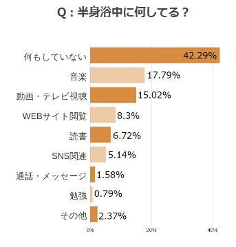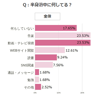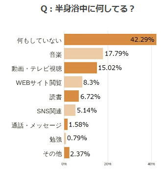 半身浴中は、上半身が湯から出ているため濡れにくく、タブレットを利用したり、読書をしたりするのが全身浴よりもしやすくなるように思えますが、 意外なことに“何もしていない”という回答が4割以上で1位という結果になりました。2位の音楽も17.79%ということで、かなりの差をつけています。
