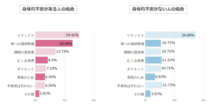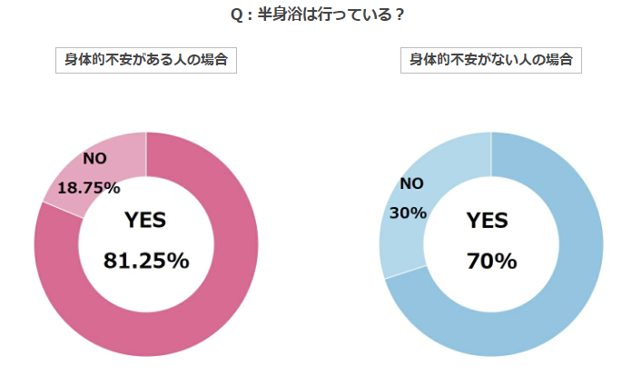 ただし、全身浴で得られる効果は血圧の上昇や水圧による内臓の圧迫などが半身浴に比べて強く、人によっては体に負担がかかっているように感じる場合があります。 調査結果でも、自然と負担を感じているからなのか、”身体的不安がある”人のほうが半身浴を行っている割合が高いという結果となりました。