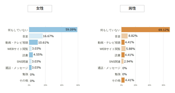 入浴時間別に見てみると、入浴時間が短くなるにつて“何もしていない”割合が高くなり、入浴時間が10分以下の人の場合は、約7割近くが何もしていないとのことでした。 一方、15分よりも長い人の場合は、何もしていないという割合が17%で、音楽や動画・テレビ視聴がそれぞれ2割以上という結果となりました。