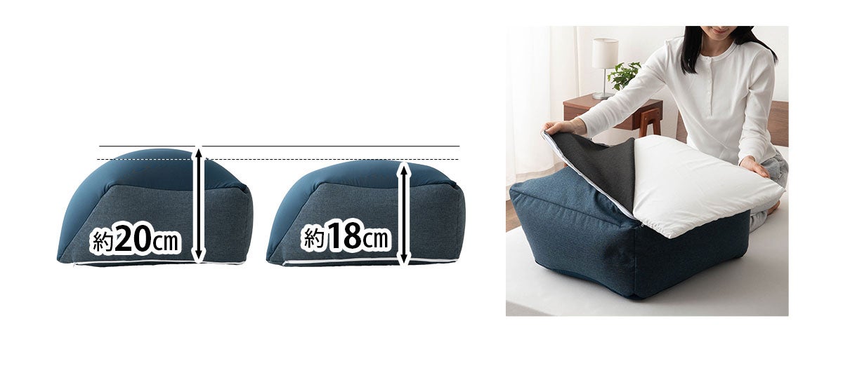 シリーズ累計3万個を販売する人気シリーズから新しい「ケアまくら」が登場!贅沢ボリューム&高さ調整機能付きでしっかりと『ふくらはぎを支えるまくら』です。