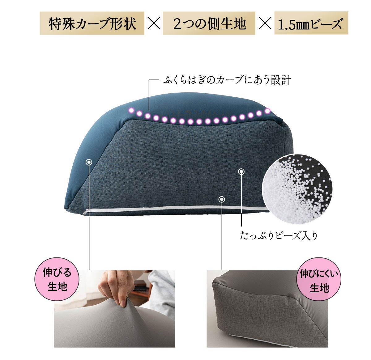 身体に心地よくフィットする伸縮性の高い生地と、形をしっかりキープする伸びにくい生地を組み合わせました。ビーズの過度な移動を防ぎ、長時間でも安定した快適さをお楽しみいただけます。
