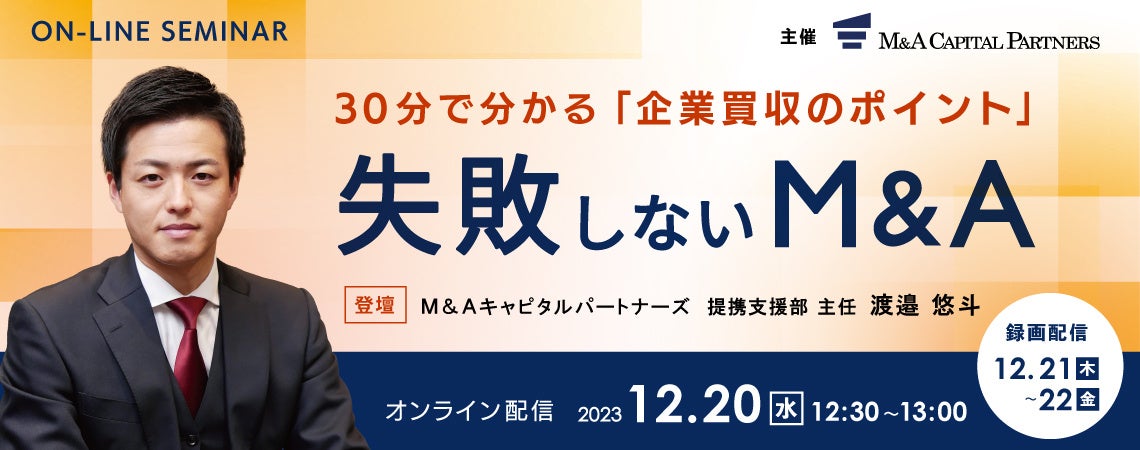当社では、日々多くの企業から買収のご相談を承っております。その中でも特に多くご質問いただく「企業買収のポイント」について、30分で講演をいたします。既にM&Aの経験のある方、これから買収を検討する方などM&Aにかかわる皆様の参考となるセミナーです。
