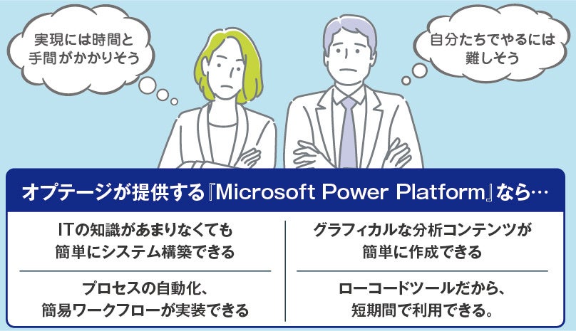 当社では、業務効率化を支援するソリューションを幅広くラインアップしており、さまざまなサービス領域を組み合わせることで、お客さまの課題をワンストップで解決いたします。本展示会では、短期間でソフトウェアなどを構築するローコード開発ツール「Microsoft Power Platform」をご紹介し、Microsoftの関連製品であるDynamics 365、Microsoft 365、Microsoft Azureを組み合わせることで、関連製品の連携までフルサポートいたします。