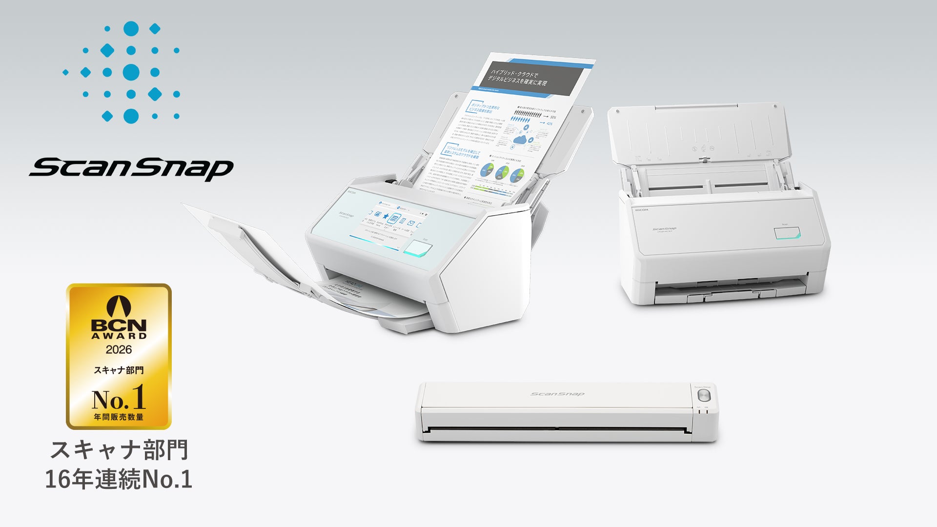 2001年の発売開始以来ご愛顧いただいているイメージスキャナー「ScanSnap」シリーズは、家電市場POSデータサービス「BCNランキング」のスキャナ部門において、2025年まで16年連続でシェアNo.1を達成しました。