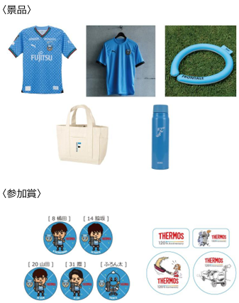 スタジアムにマイボトルもしくはマイタンブラー(※他社製品も可)を持参いただいた方限定で、サーモスブースにて簡単なアンケートにご回答にいただくと、選手のサイン入りアイテムなど豪華賞品が当たる抽選会に参加できます。選手の直筆サイン入りユニフォームや暑い夏にぴったりなサーモスの製品などが合計35名様に当たります。抽選が外れた方にも、参加賞として川崎フロンターレ選手のオリジナル缶バッジ(1個)やサーモス120周年オリジナルステッカー(1セット)を差し上げます。