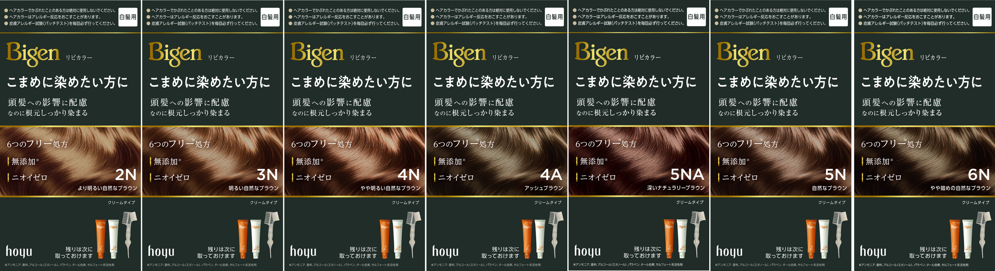 2N:より明るい自然なブラウン 3N:明るい自然なブラウン 4N:やや明るい自然なブラウン 4A:アッシュブラウン 5N:自然なブラウン 5NA:深いナチュラリーブラウン 6N:やや暗めの自然なブラウン |