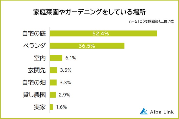 家庭菜園やガーデニングをしている510人に「家庭菜園やガーデニングをどこで行っているか」を聞いたところ、最も多かったのは「自宅の庭(52.4%)」で、半数以上を占めました。