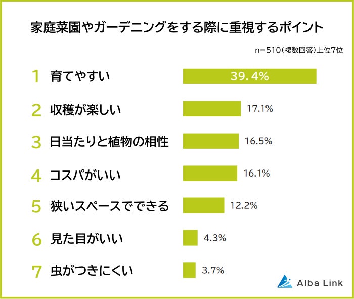 株式会社AlbaLink(本社:東京都江東区、代表取締役:河田 憲二)は、家庭菜園やガーデニングをしている510人を対象に「家庭菜園やガーデニングに関する意識調査」を実施し、そのデータをランキングにしました。