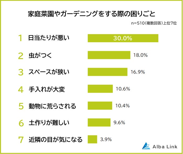 家庭菜園やガーデニングで困っていることの圧倒的1位は「日当たりが悪い(30.0%)」。2位「虫がつく(18.0%)」、3位「スペースが狭い(16.9%)」が続きます。大きく分けると「育てる場所の環境」「労力」「害虫・害獣」といった項目がランクインしています。