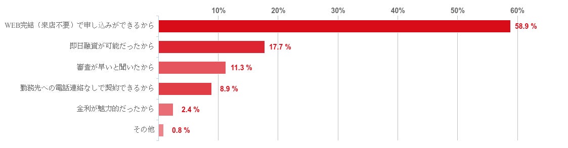最も多かったのはWeb完結で申し込める点で58.9%だったが、レイクで即日融資が可能なことを理由に借入先として選んだ人も17.7%いた。