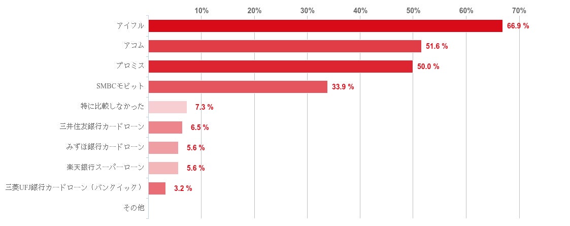 レイクと同じ大手の消費者金融を比較対象としている人が多かった。レイクで即日の借入を検討している人が、他の消費者金融の審査スピードや手続きの利便性などを比べていると考えられる。