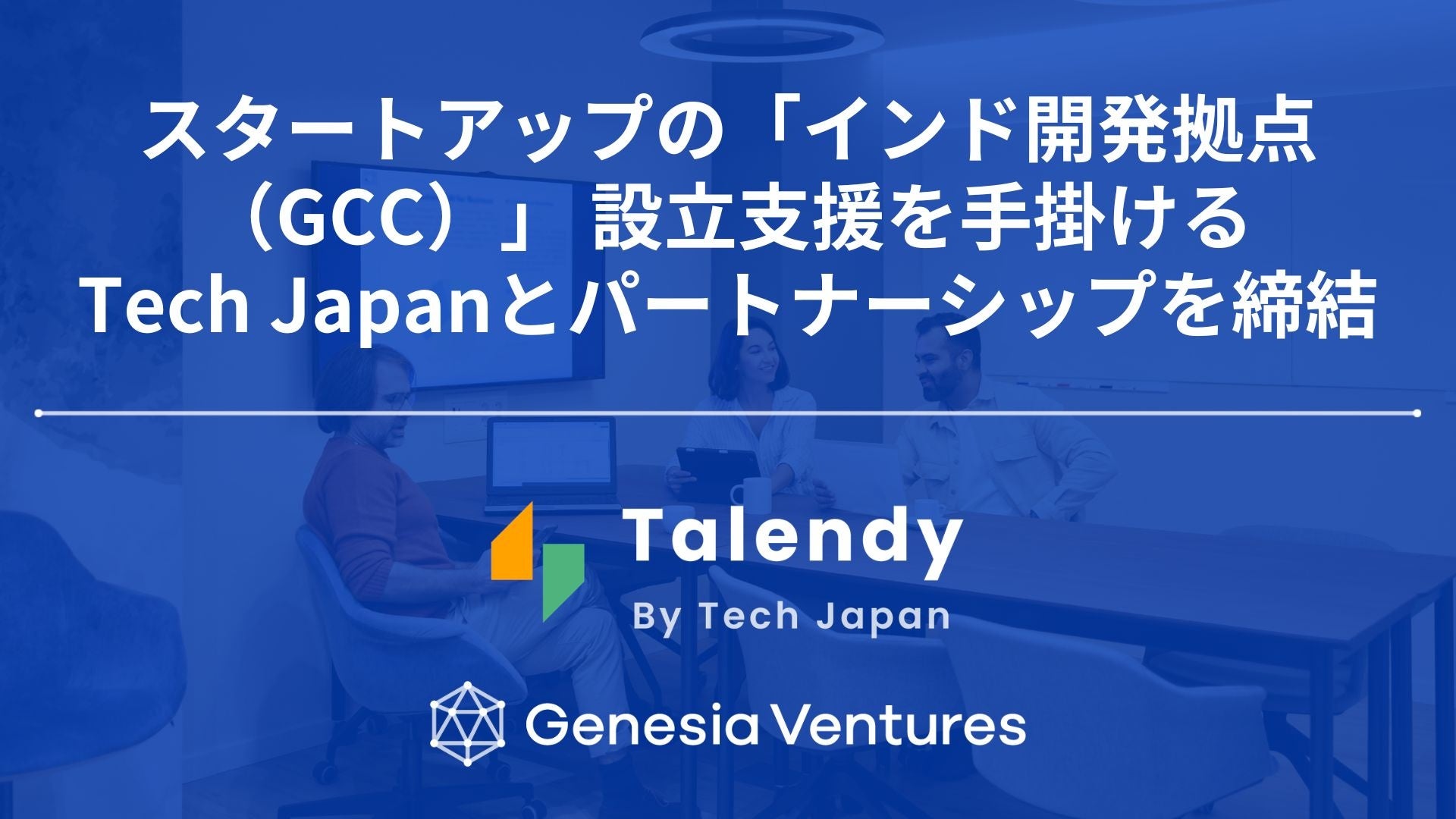 株式会社ジェネシア・ベンチャーズ(代表取締役:田島 聡一、本社:東京都渋谷区)は、高度インド人材に特化したHRプラットフォーム『Talendy』を展開するTech Japan株式会社(代表取締役:西山 直隆、本社:東京都千代田区)とインド開発拠点の設立支援に関するパートナーシップを締結したことをお知らせいたします。