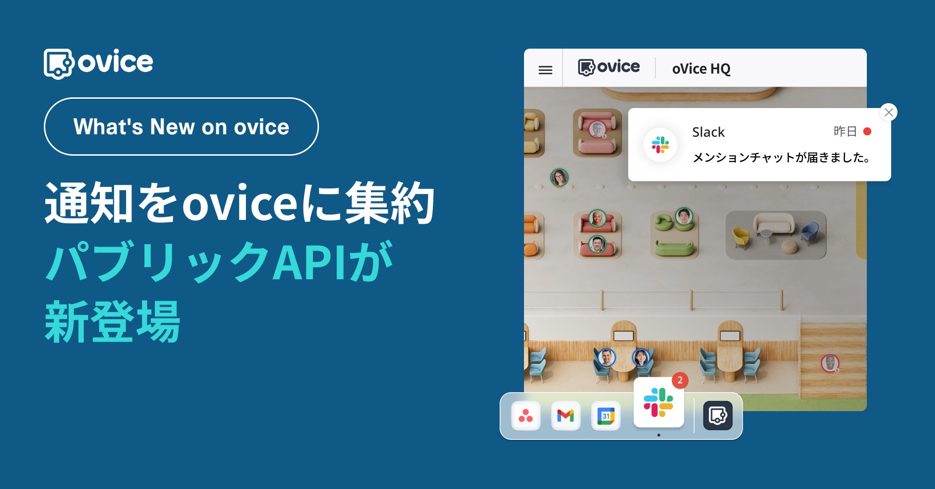 oVice株式会社(本社:石川県七尾市、代表取締役CEO:ジョン・セーヒョン)は、誰もが、どこからでも“つながる”バーチャルオフィス「ovice(オヴィス)」の新機能として、さまざまなWebサービスとoviceとを連携させ、ovice上に外部Webサービスの通知を表示することができる「パブリックAPI」機能を公開しました。