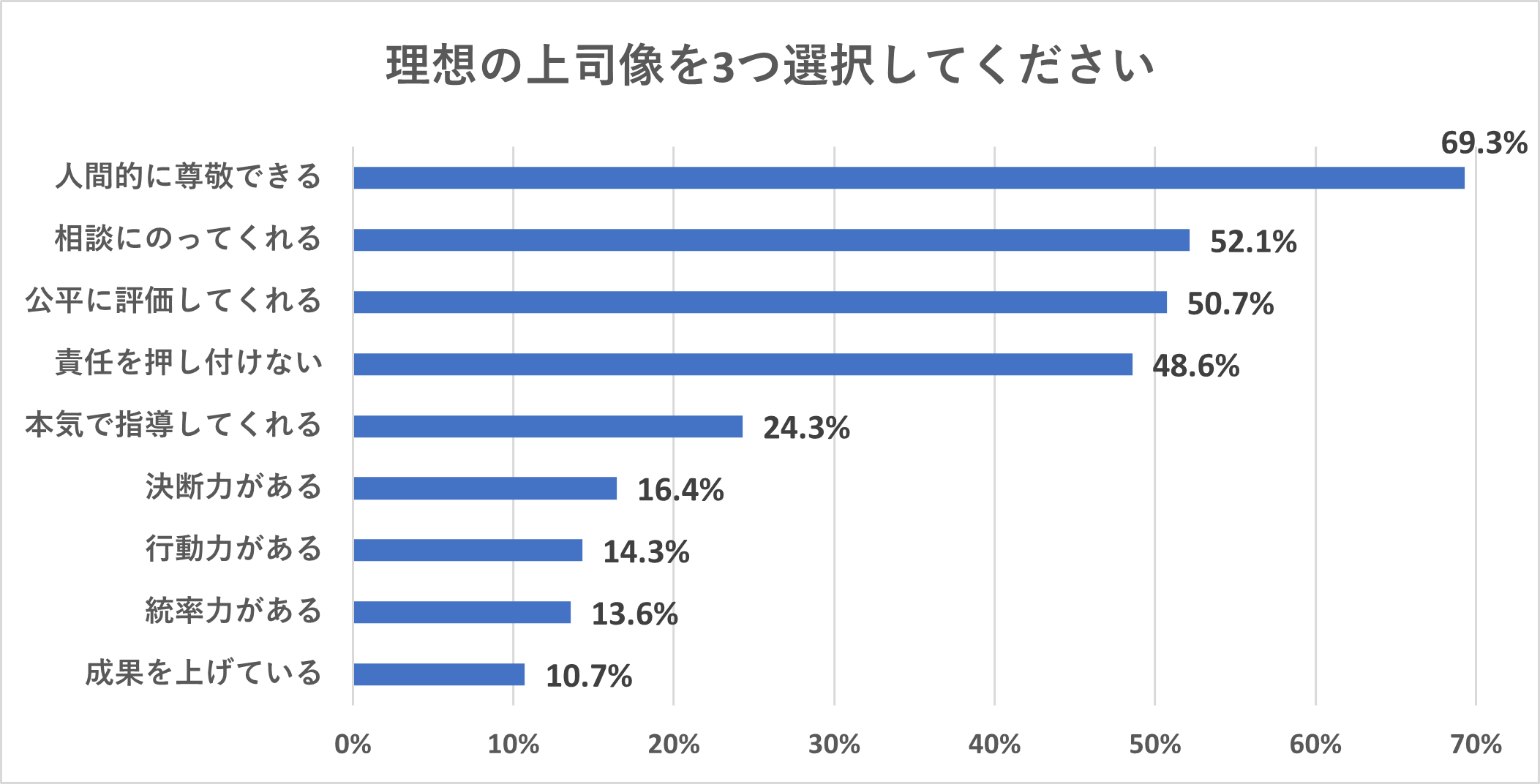 「理想の上司像を3つ選択してください」と質問したところ、1位「人間的に尊敬できる」が69.3%、2位「相談にのってくれる」が52.1%、3位「公平に評価してくれる」が50.7%となりました。