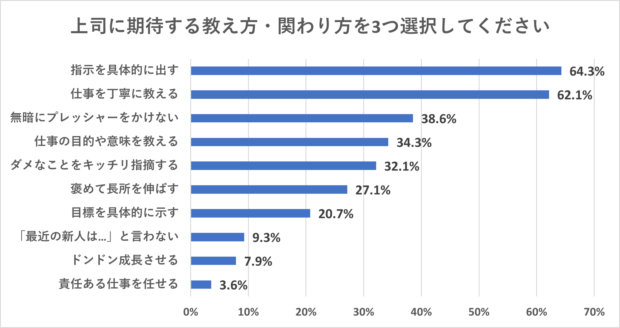 「上司に期待する教え方・関わり方を3つ選択してください」と質問したところ、1位「具体的な指示を出す」が64.3%、2位「仕事を丁寧に教える」が62.1%、3位「無暗にプレッシャーをかけない」が38.6%となりました。