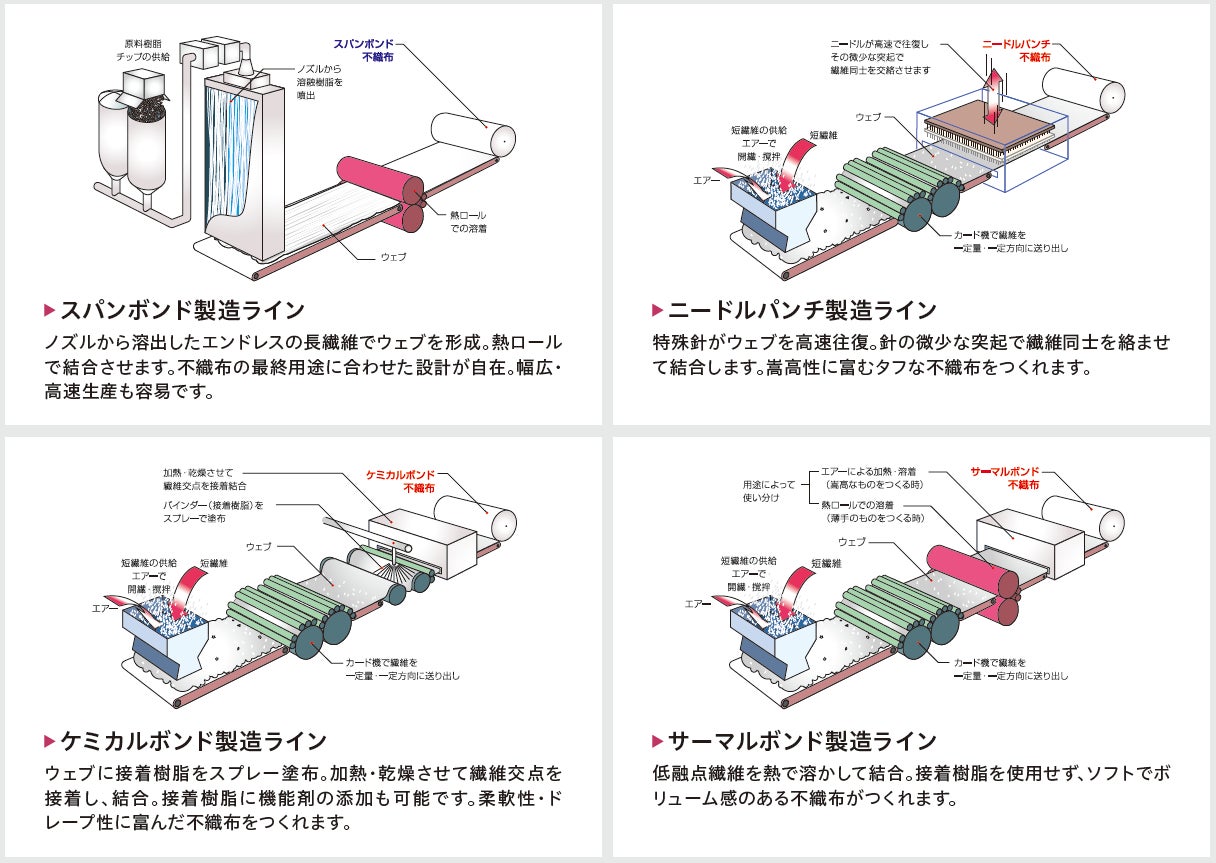 当社は、1972年の設立以来、インフラ(社会資本)の整備・維持に携わる会社として、土木資材の製造・販売ならびに各種繊維を原料とした産業資材および不織布の製造・加工・販売を行うことで業容を拡大してまいりました。不織布におきましては、1980年代にマスク等の衛生資材に使用されている「スパンボンド不織布」を生産した会社です。その他一般産業資材用途から衛生資材用途まで幅広く生産しており、身近な製品にも前田工繊の不織布が多数使用されています。