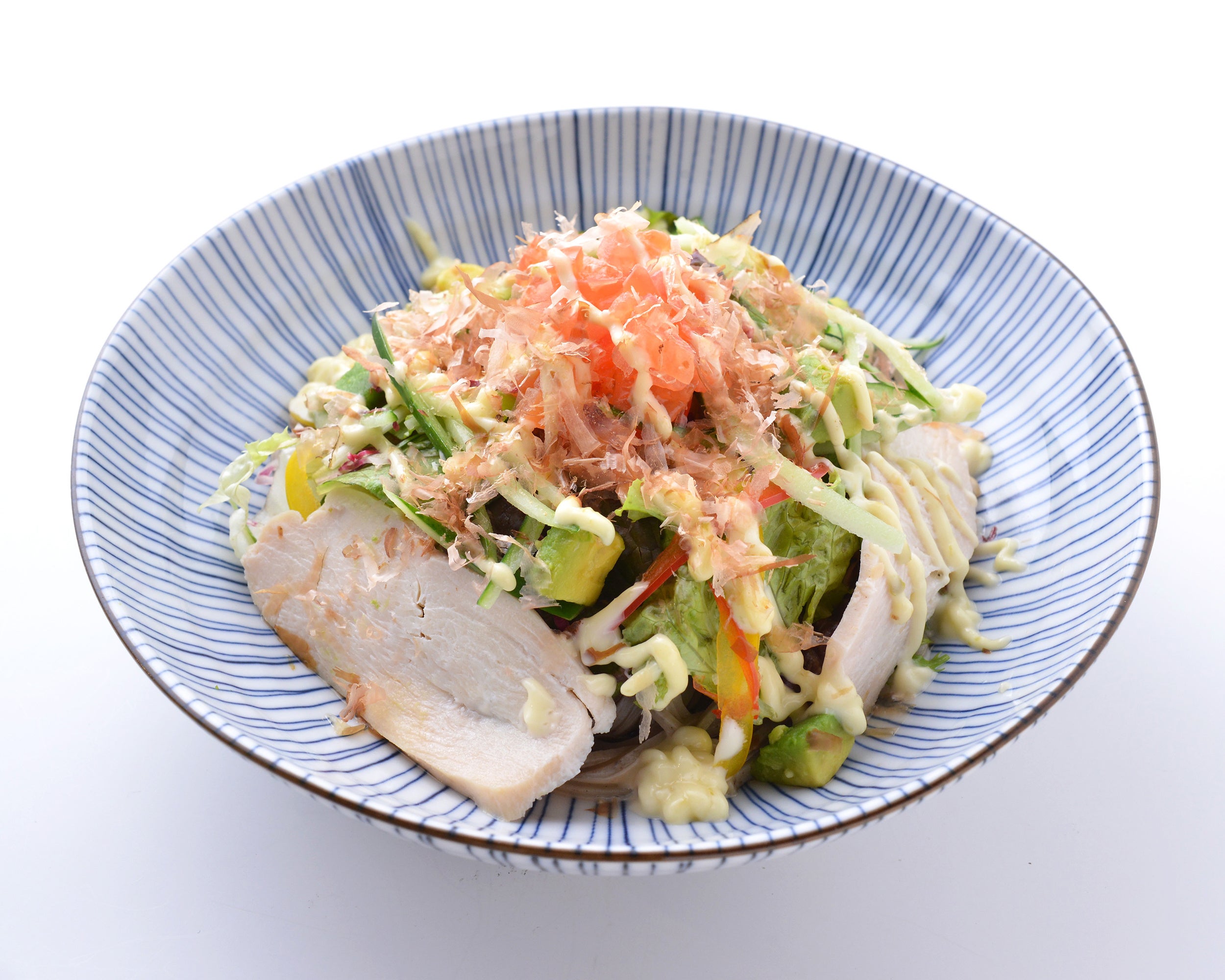 十割そばに、アボカドやトマト、パプリカなどの野菜をたっぷりと。蒸し鶏ものせました。