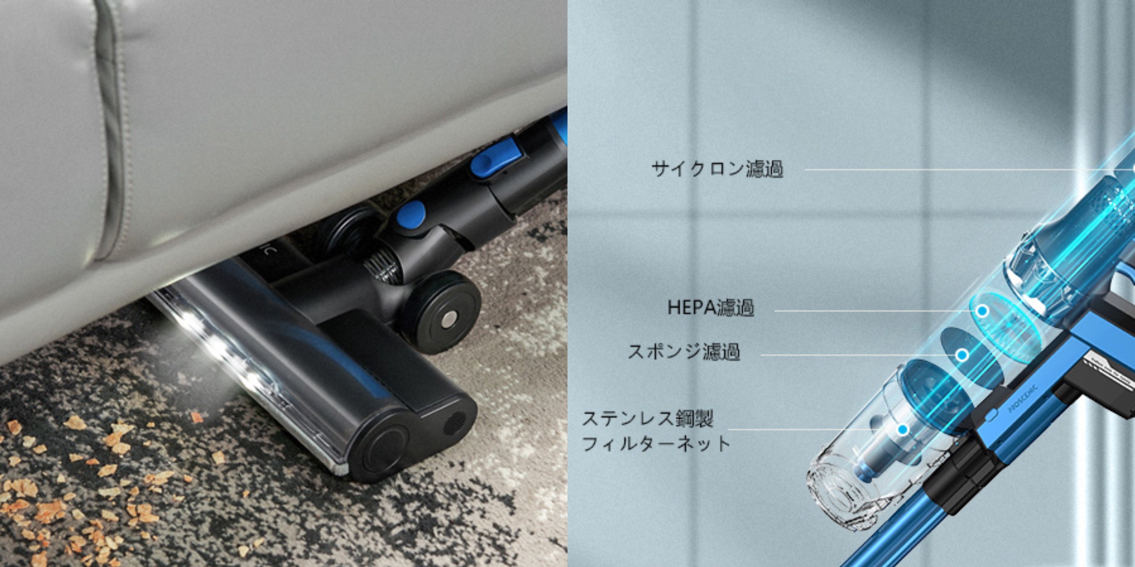 4層HEPAフィルターシステムは、微細な塵や花粉などの微小な粒子をキャッチして、室内の空気を清潔に保ちます。LEDライトが暗い場所を照らすために装備されているため、隅々まで掃除することができます。