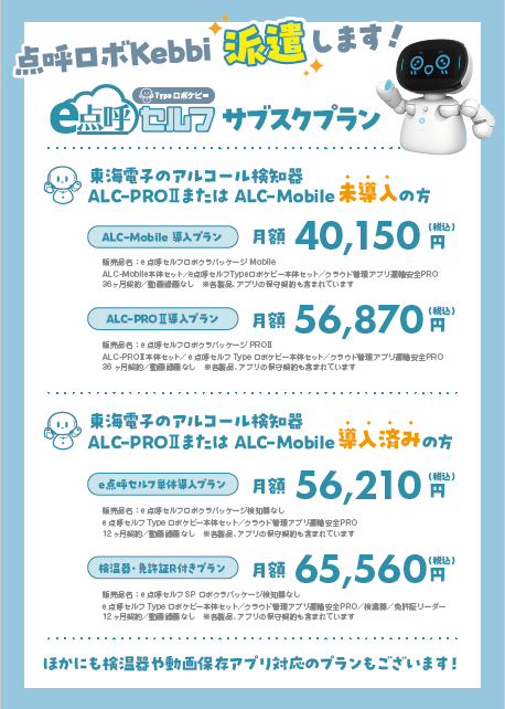 当社のロボット点呼をご導入の際は、『e点呼セルフ typeロボケビー』月額サブスクリクションをお薦め致します。既に当社アルコール検知器を導入済のユーザー様には、『e点呼セルフ typeロボケビー』とクラウド管理アプリ『運輸安全PRO』をセットにしたプランもございます。