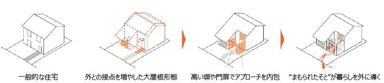建築と一体化した高い塀や門扉でアプローチを内包した「路地庭」のある住まいを提案。 外との接点を増やすように1階のボリュームを広げた大屋根形態と、路地庭による「隔たり」と「つながり」を両立する“まもられたそと”により、内部空間を拡張しながら暮らしを自然と外へ導き、家族の暮らしを地域にやさしくにじませます。