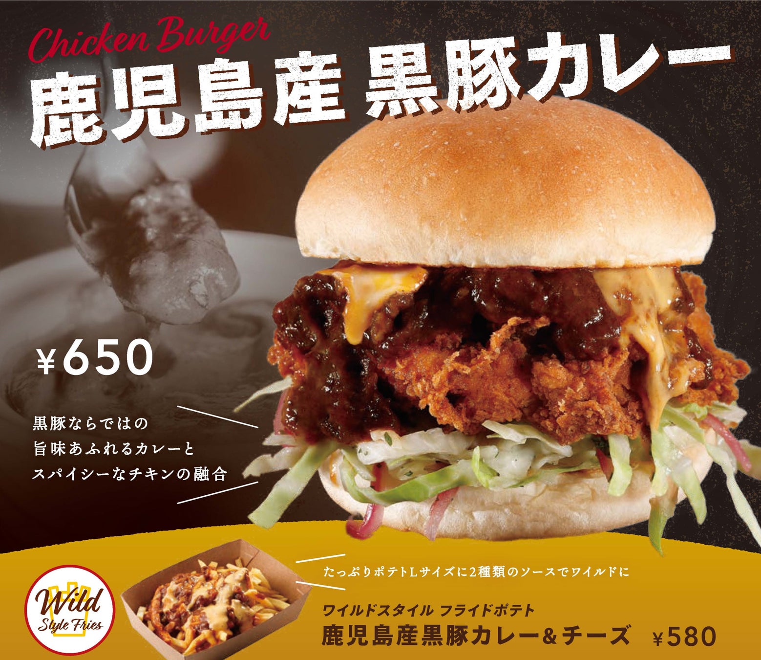 同時発売のワイルドスタイルフライドポテト第2弾「鹿児島産黒豚カレー&チーズソース」は、Lサイズのフライドポテトに“カレー“と”チーズソース“をかけました。食べすすめるとカレーとチーズが混ざり合い、味の変化もお楽しみいただけます。オリジナルチキンバーガーやお酒のおともにぴったりな一品です。