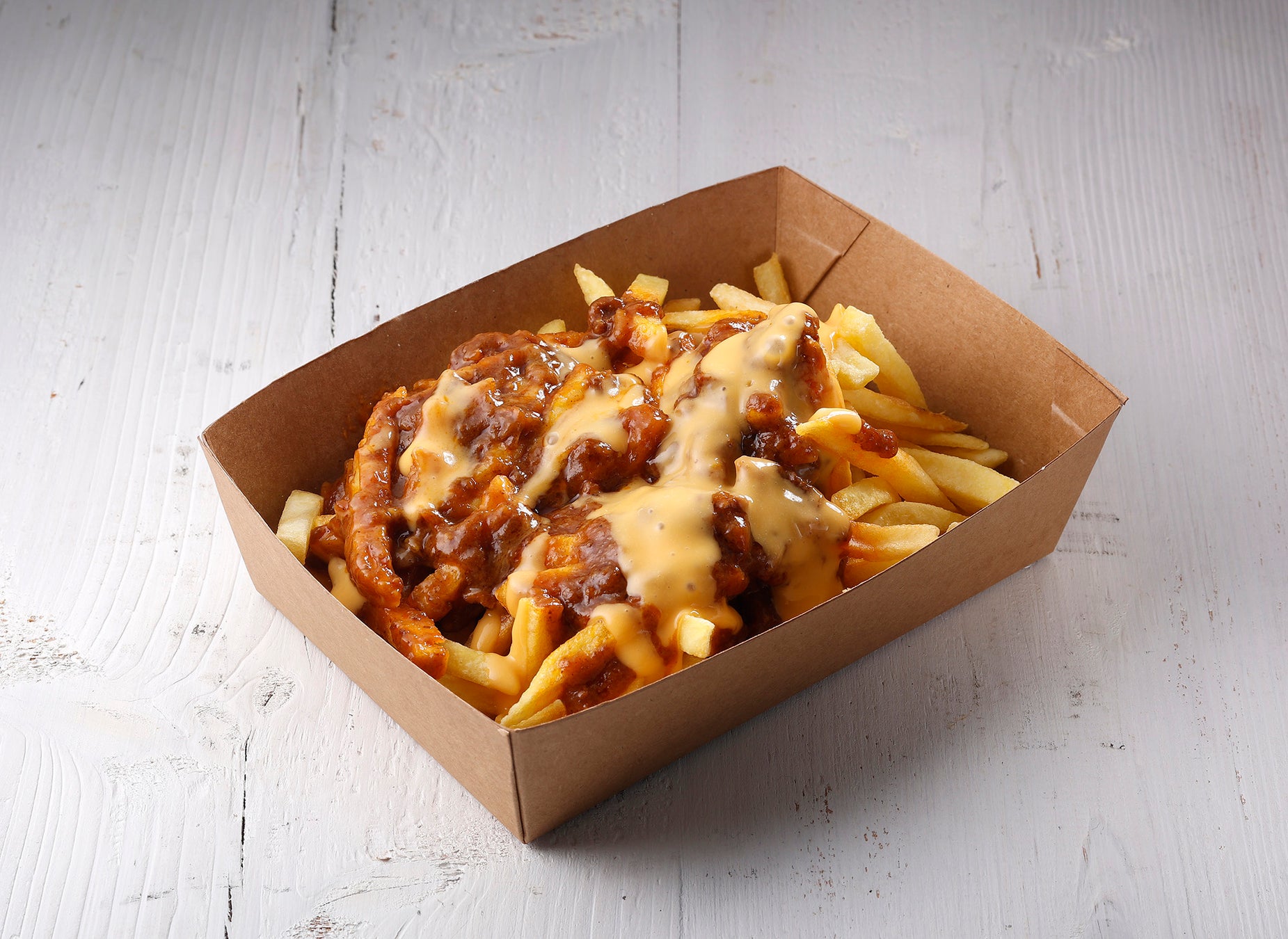 黒豚と野菜の旨みあふれる”カレー“と”チーズソース“をかけたLサイズのフライドポテトです。