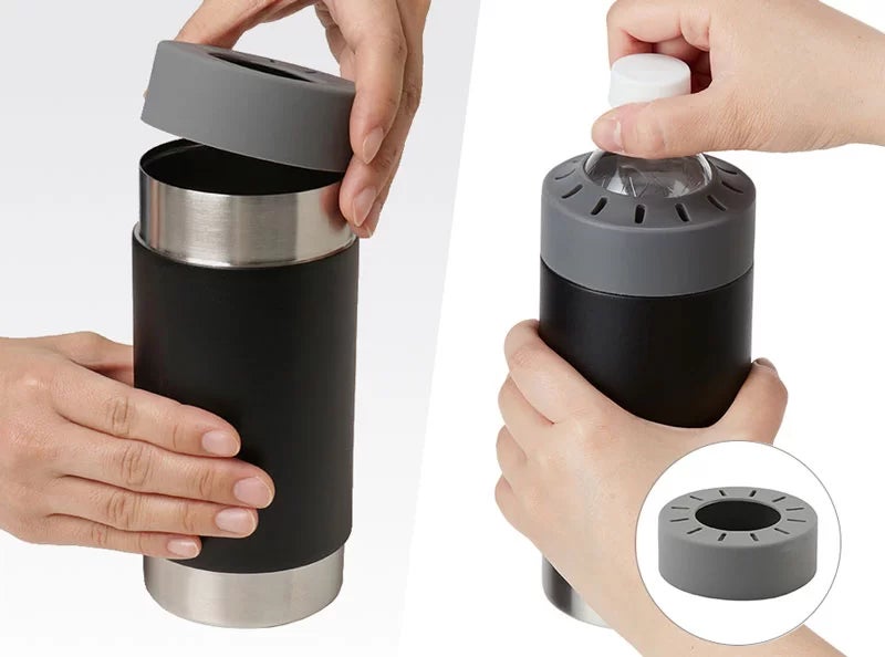シリコンパーツを取り付けることで、ボトルホルダーとサーモタンブラーの2WAY仕様。夏は冷たいペットボトルホルダーとしても使え、通年便利です。