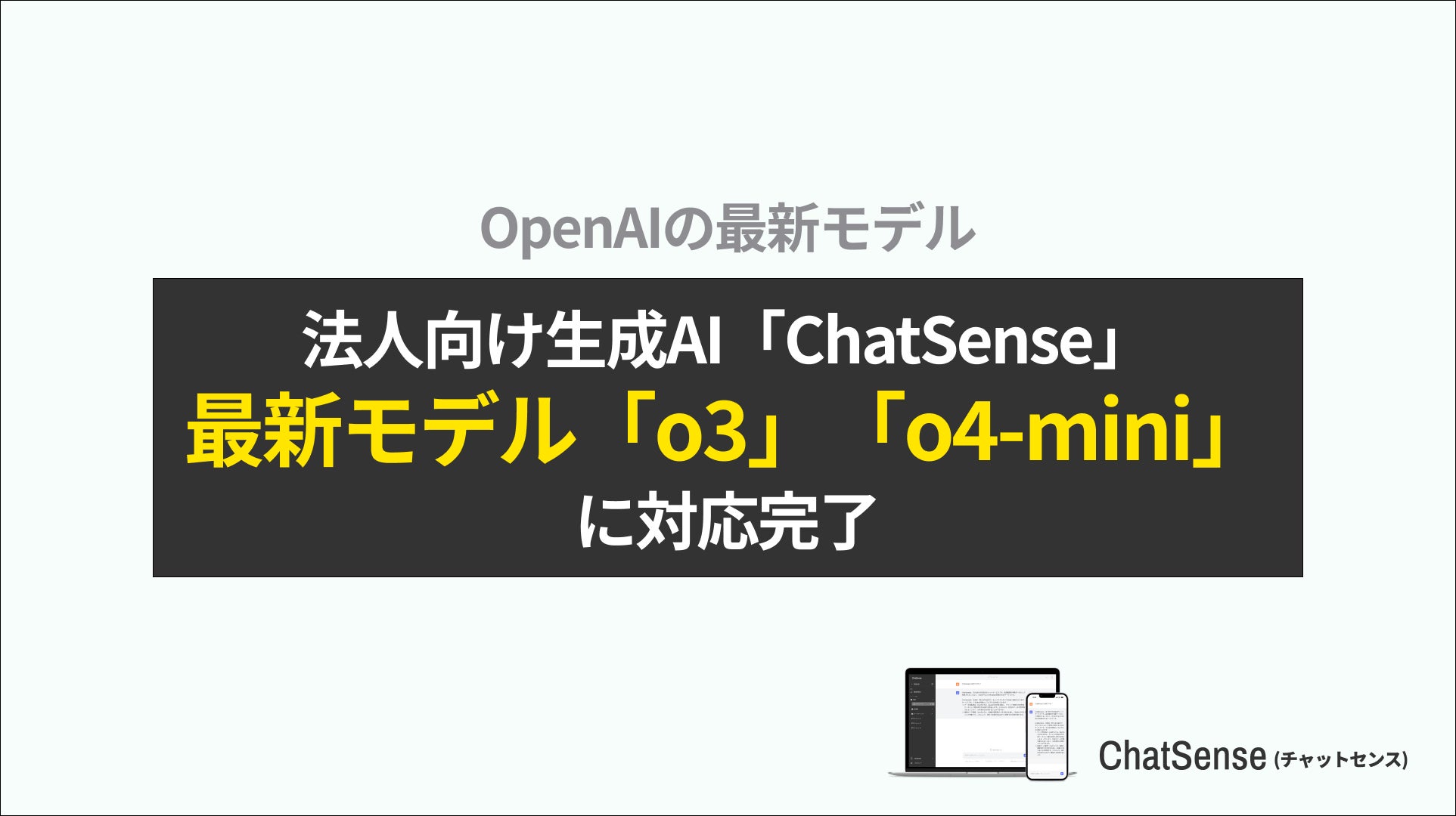 株式会社ナレッジセンスは、セキュアな環境でChatGPTを活用できる、法人向けChatGPTシステム「ChatSense」を提供しております。この度、ChatSense内で利用できるAIモデルに関して、OpenAI社の最新AIである OpenAI o3、o4-mini に対応完了したことをお知らせ致します。この度対応完了した「o3」「o4-mini」は、複雑な問題解決能力に特化したモデルです。「o3」「o4-mini」は、これまでの最高性能モデル「GPT-4o」とは違い、AIが「より長く考える」能力を強化し、複雑な問題解決に対応できるように設計されたものです。oシリーズは特に、理数系の問題に優れているとされています(OpenAI公式情報)。ChatSenseが o3、o4-miniに対応することで、法人ユーザーの皆様がより良い生成AIモデルを比較する際に参考としていただくことが可能になります。法人向けChatGPT「ChatSense」の詳細はこちらをご覧ください。https://chatsense.jp/?utm_source=192
