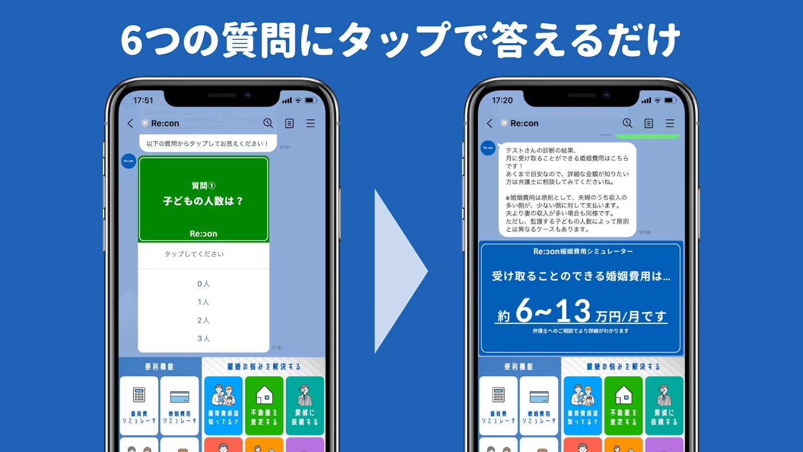 Re:con(リコン)は、公式LINEをプラットフォームとした「離婚」の課題をテクノロジーを通じて解消するサービスです。