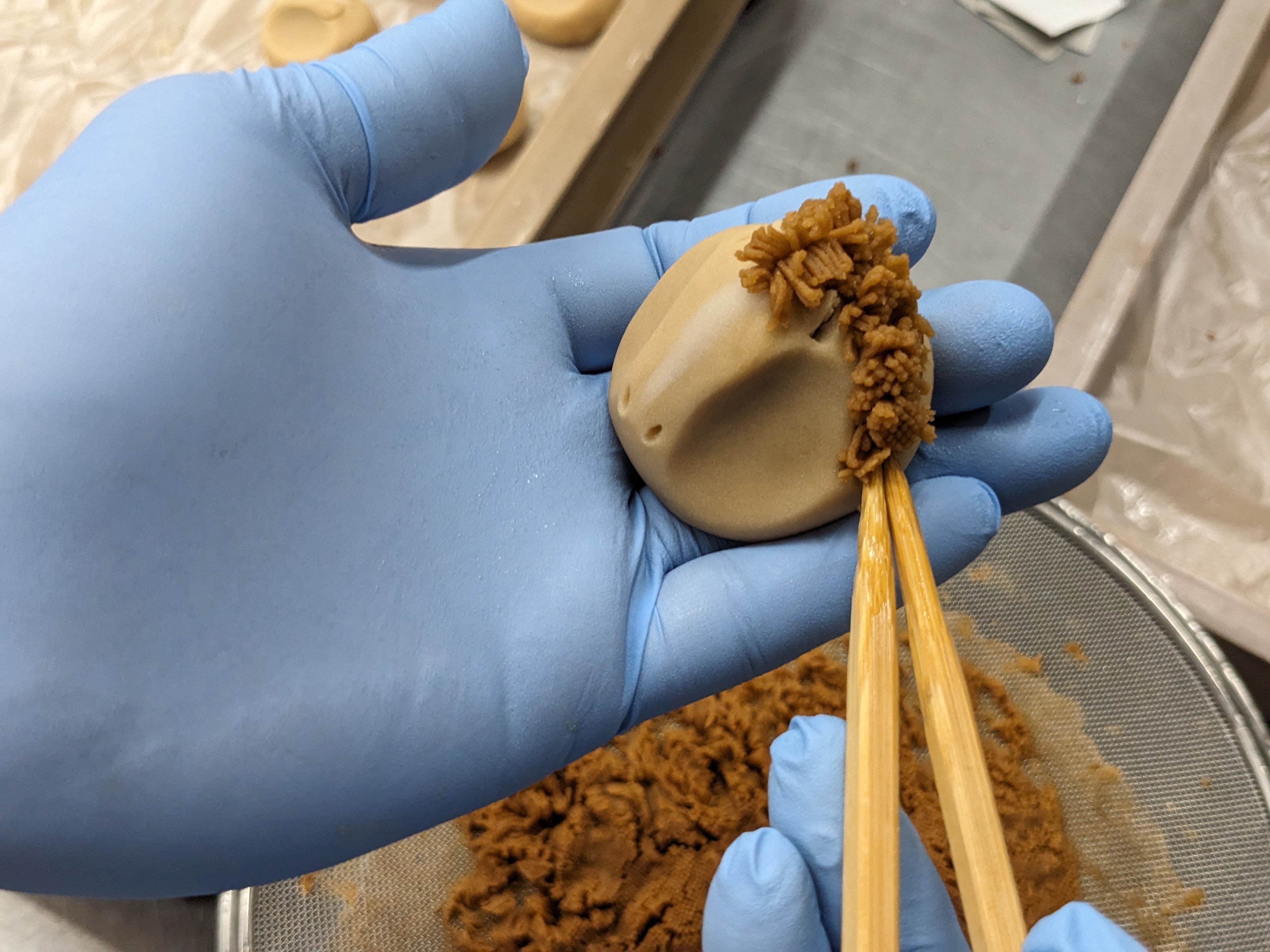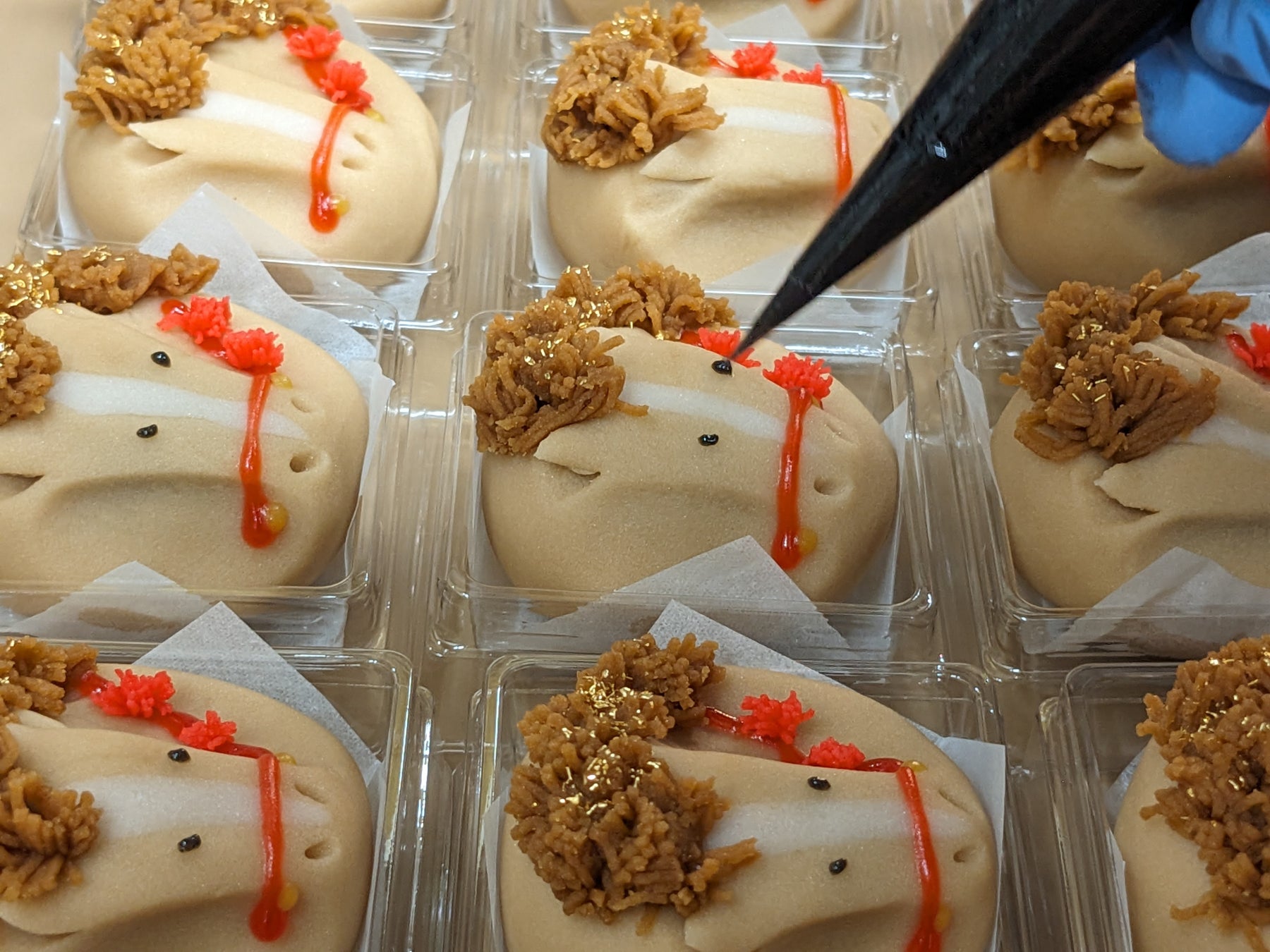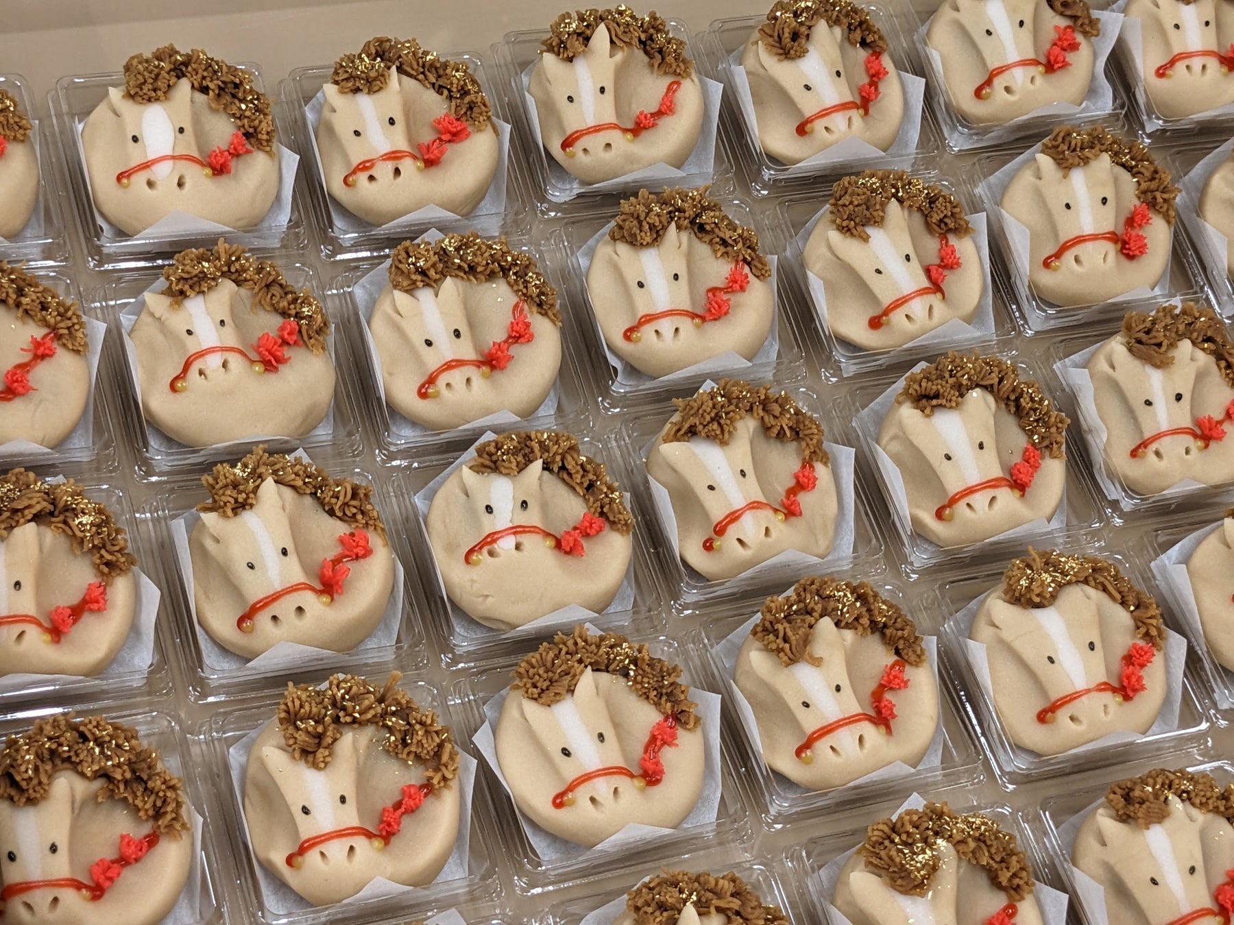 お亀堂ではこの『午』の持つ力を、金箔と華やかな馬具をまとった上生菓子に表現。一つひとつ手作りで、神様の依り代にふさわしい神秘的な姿に仕上げました。