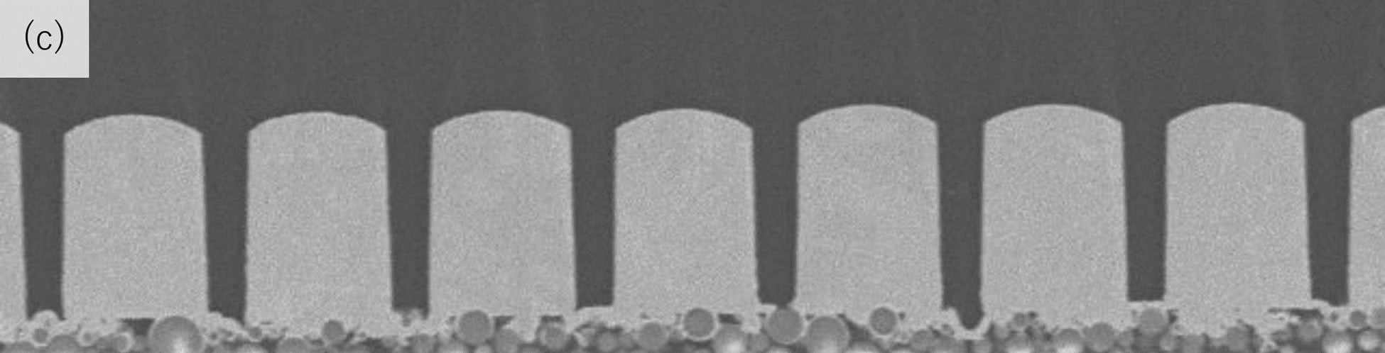 このたび当社が長年培ってきた感光性材料技術と新たな材料設計を元に開発した「TAシリーズ」は、RDL形成に求められる4µmピッチデザインにおいてLDI露光でのレジスト幅1.0µmのパターンが形成可能であり、パネルレベルパッケージ※4などの微細配線形成に適した感光性フィルム材料です(図aおよびb)。得られた微細レジストパターンはSAP(セミアディティブプロセス)※5によるめっきパターン形成と続くレジスト剥離により、4µmピッチデザインにおいて3µm幅のめっきパターンの形成が可能です(図c)。