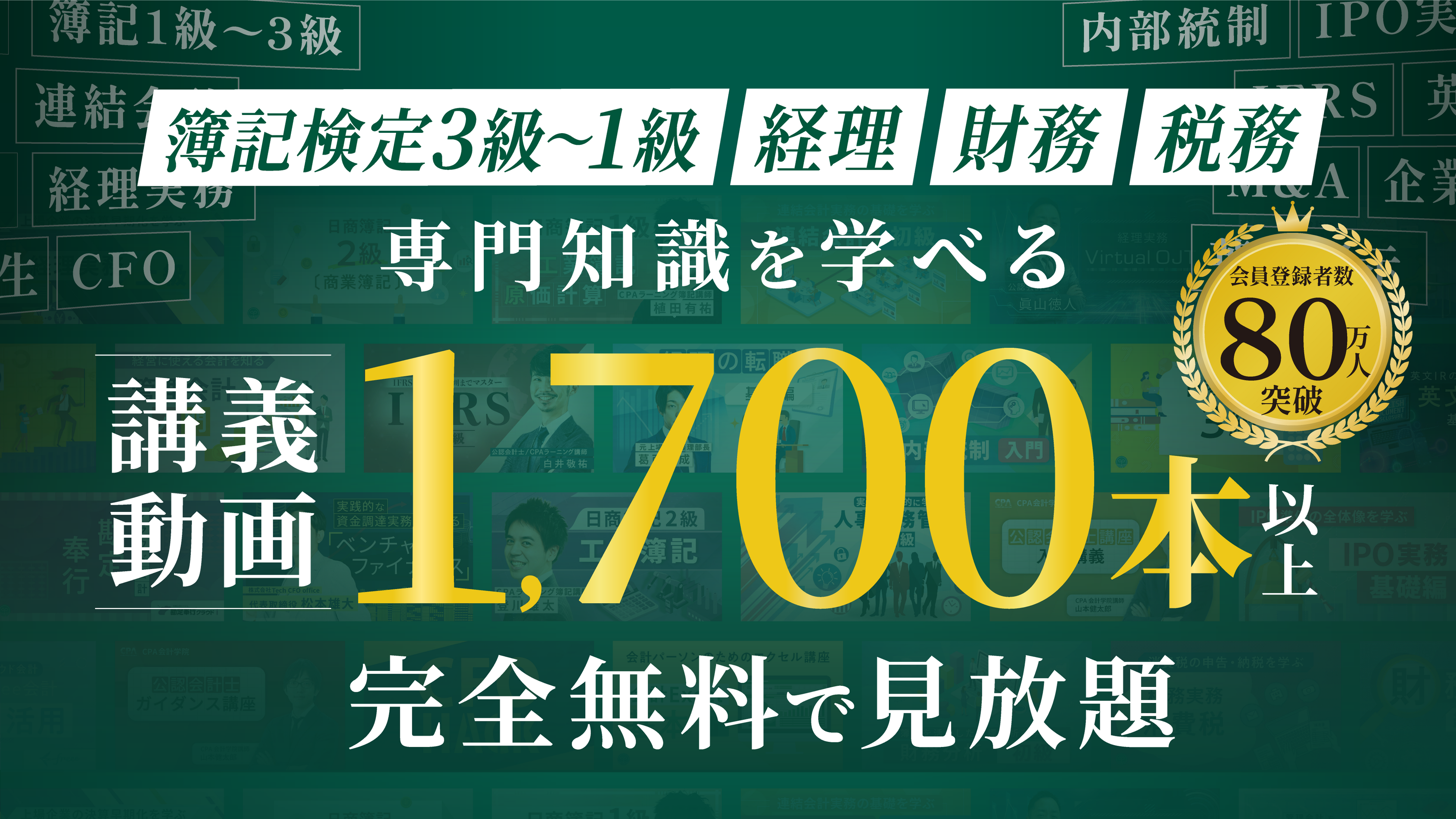 簿記3級〜1級、経理・会計実務講座など、1,700本以上の講義動画、テキストPDF、模擬試験が会員登録のみで無料で利用でき、分かりやすい講義で実務スキルや資格取得をサポートしています。累計登録者数は80万人を超え、多くの人に会計ファイナンスについて学べる機会を提供しています。