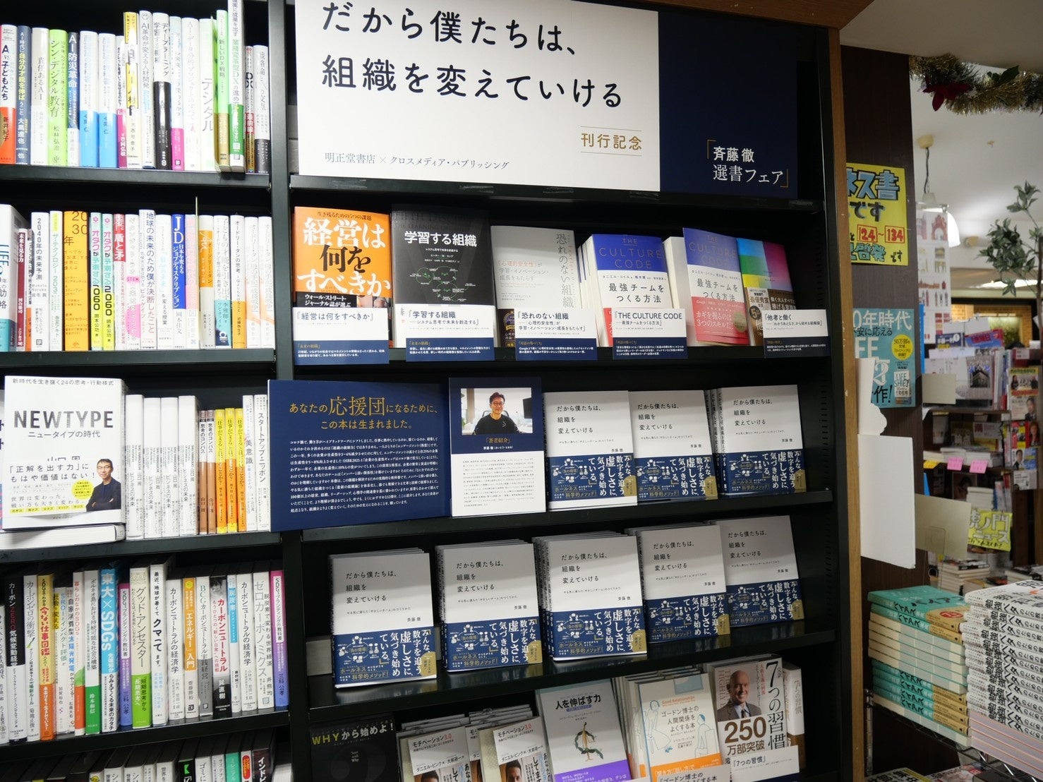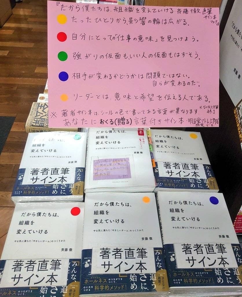 2022年9月26日より、株式会社クロスメディア・パブリッシング(本社:東京都渋谷区、代表取締役社長:小早川幸一郎)は、7万部突破の書籍『だから僕たちは、組織を変えていける』の代官山 蔦屋書店 限定の書籍帯を製作し、同店での選書フェアを開始しました。このフェアでは、本書の中身に合わせた著者の直筆メッセージ入りのサイン本を陳列するとともに、本の内容をより深く理解するための名著を紹介しています。本企画は、書店との共同勉強会がきっかけとなり実現しました。