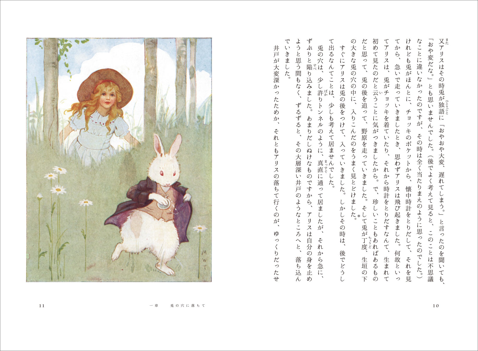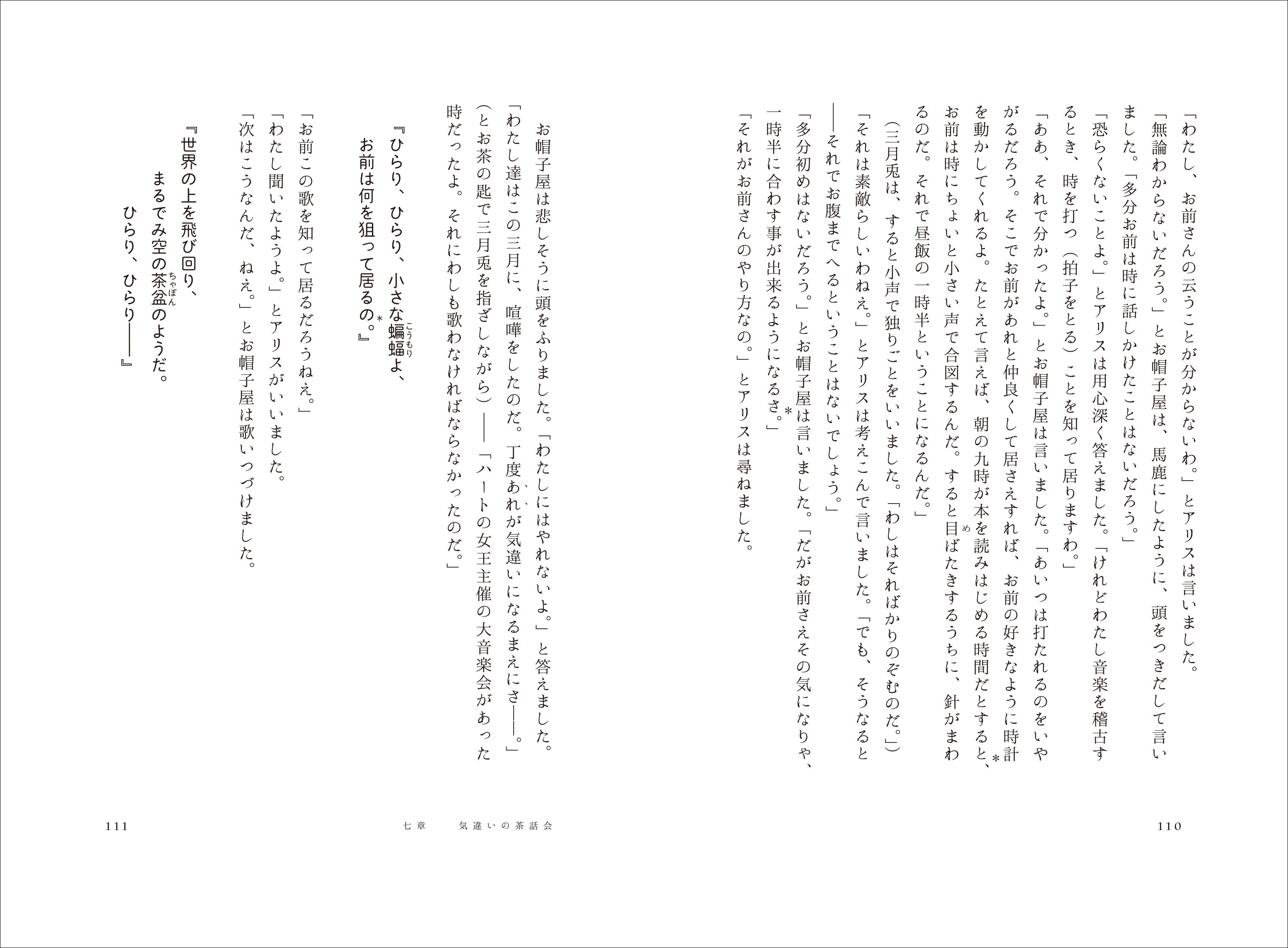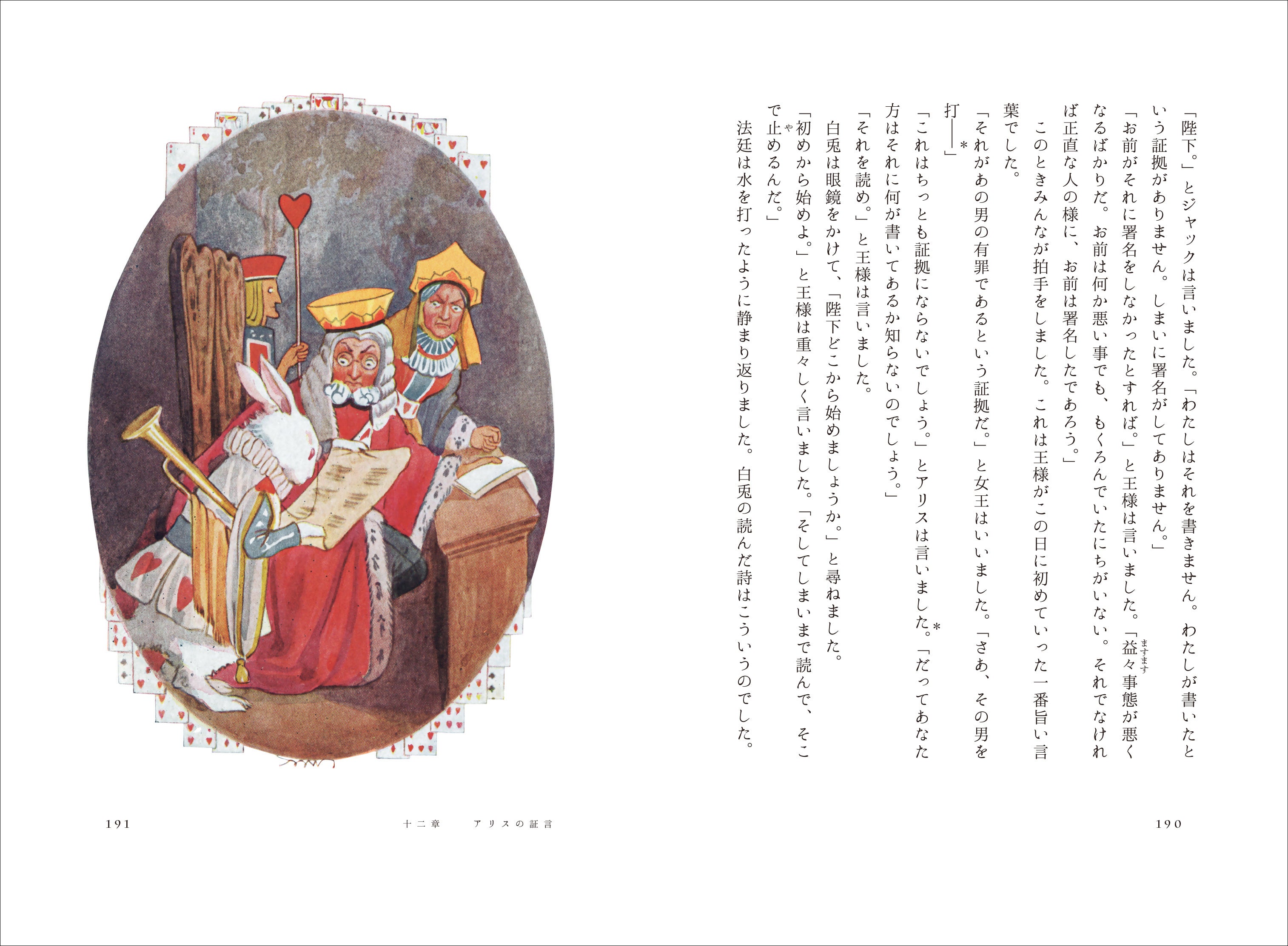 一章 兎の穴に落ちて/二章 涙の池/三章 コーカスレースと長い話/四章 兎が蜥蜴のビルを送り出す/五章 芋虫の忠告/六章 豚と胡椒/七章 気違いの茶話会/八章 女王の球打場/九章 まがい海亀の物語/十章 海老の四組舞踏/十一章 誰がお饅頭を盗んだか/十二章 アリスの証言