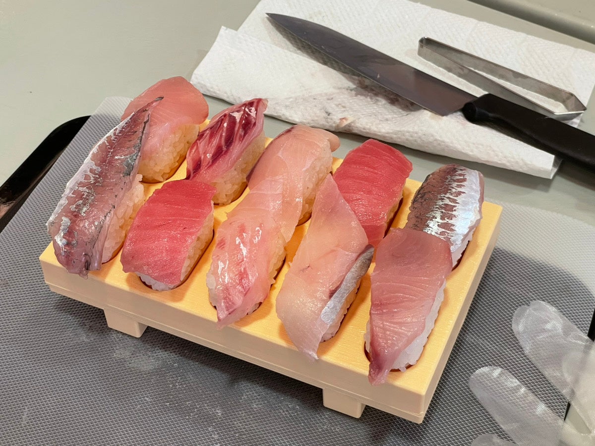 アジが捌けたら、シャリを使ってお寿司を作っていき、自分で捌いたアジと他のネタをのせて完成です。