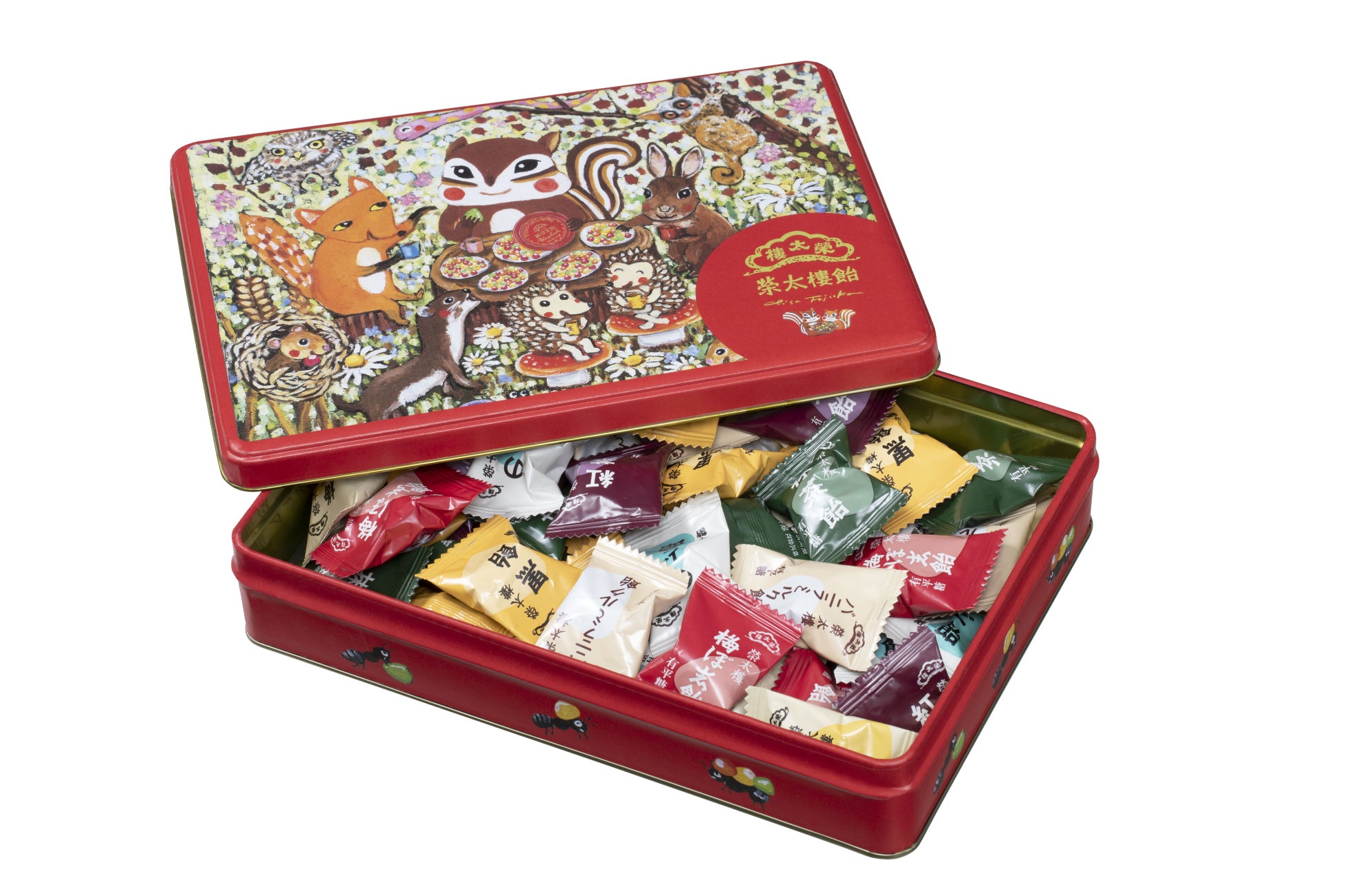 リスの手に握られている丸い榮太樓飴の缶は、藤岡ちささんの書き下ろしイラスト。