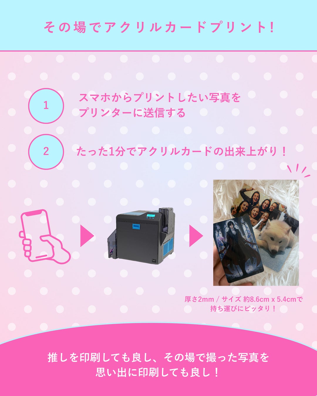 さらに、撮影した写真や好きなビジュアルをその場でアクリルカードに変換することで、その時の感動や喜びを形にして持ち帰ることができます。いつもの推し活体験を“その場限り”で終わらせず、いつでも振り返ることができる記念として残すことが可能です。