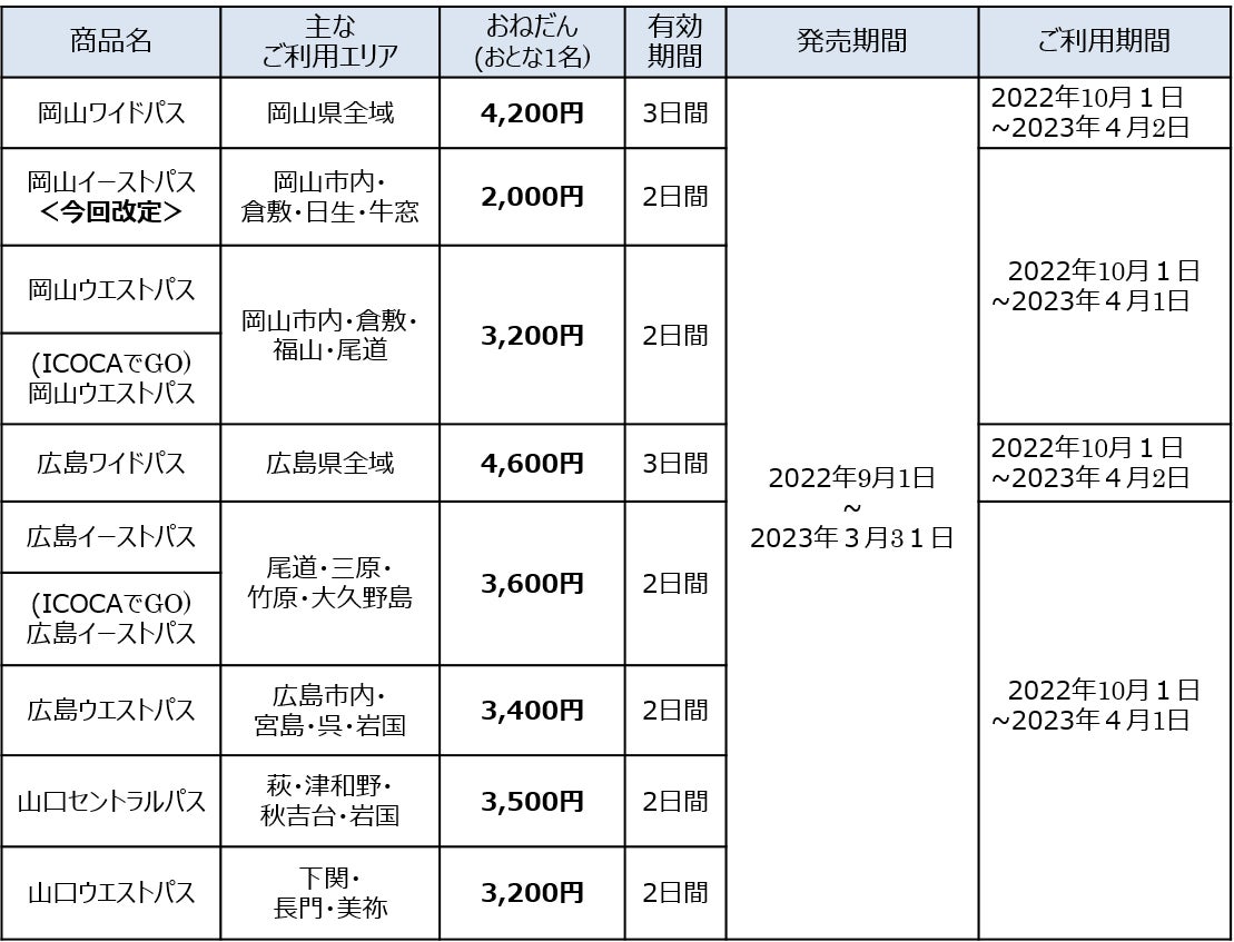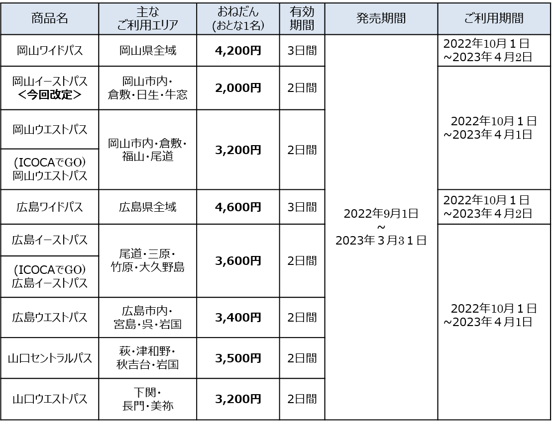 ・本年4月から発売しております、「(ICOCAでGO)岡山ウエストパス」「(ICOCAでGO)広島イーストパス」について、ご好評につき10月以降も継続発売いたします。お持ちのICOCAで自動改札機を利用でき、大変便利です。