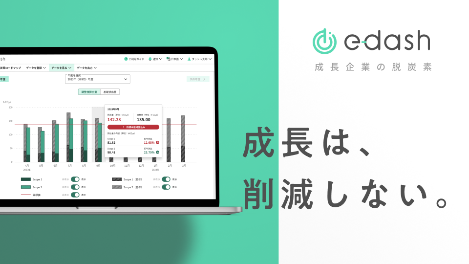 「e-dash」は、CO2排出量削減への取り組みを総合的にサポートする三井物産発のサービスプラットフォームです(※4)。