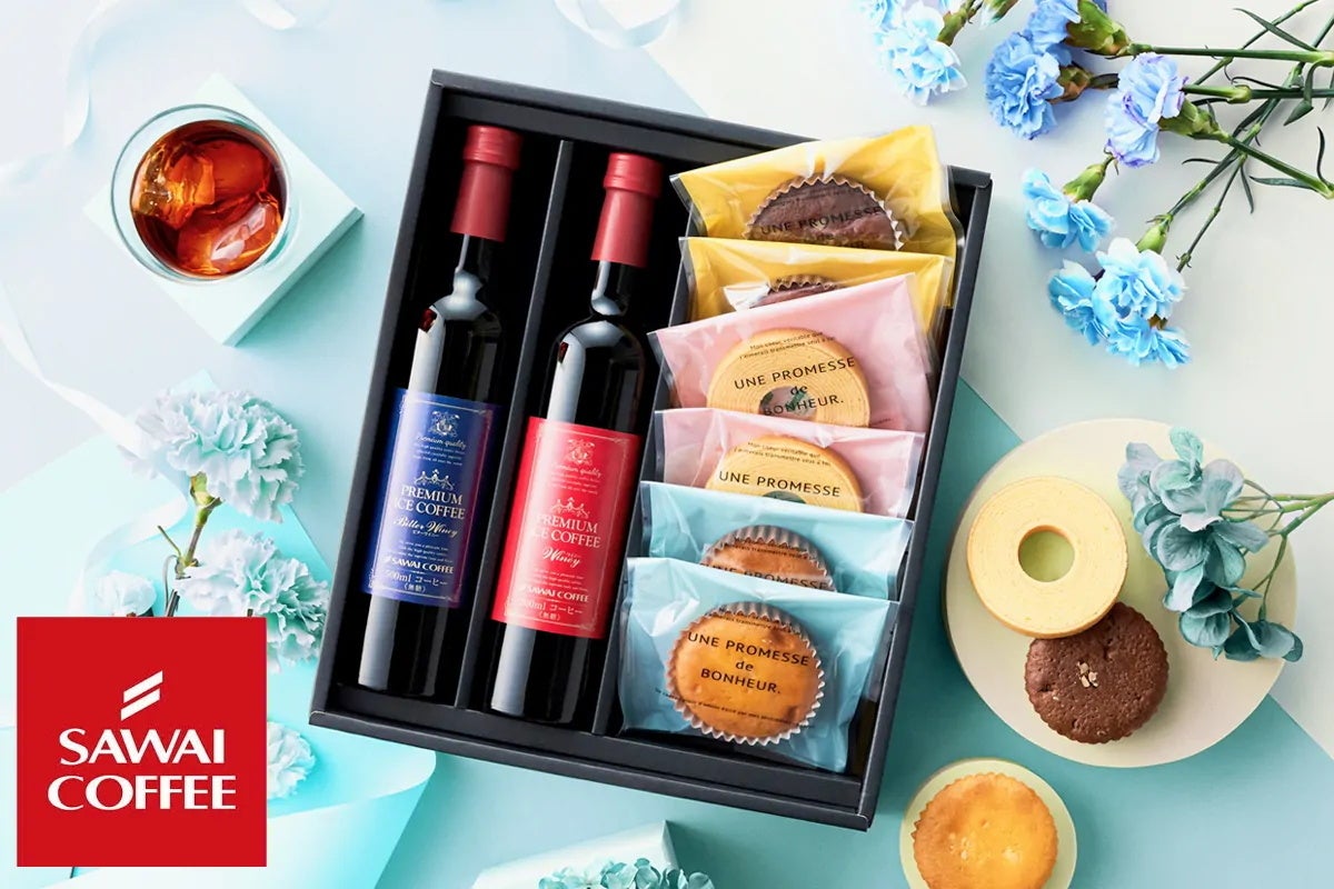 澤井珈琲のプレミアム無糖アイスコーヒー&スイーツセットは、ワイングラスのように豊かなアロマが広がる無添加アイスコーヒー500 mlと、“お花”を模した見た目もかわいい8種類の花彩つむぎスイーツを詰め合わせ、感謝状付きラッピングでお届け。