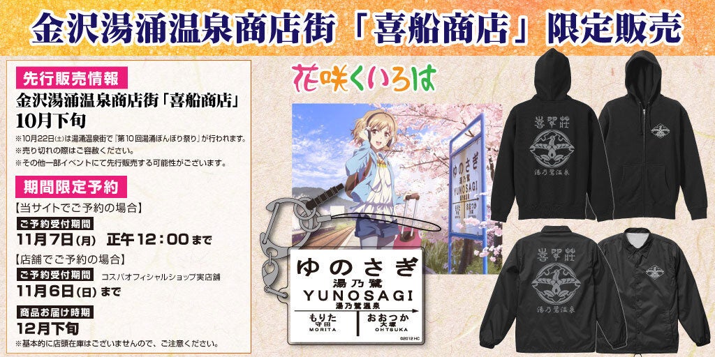 「湯乃鷺駅 アクリルマルチキーホルダー」、主人公 松前緒花が身を寄せる旅館"喜翆荘"をモチーフにした「ジップパーカー」「コーチジャケット」がラインナップいたします。